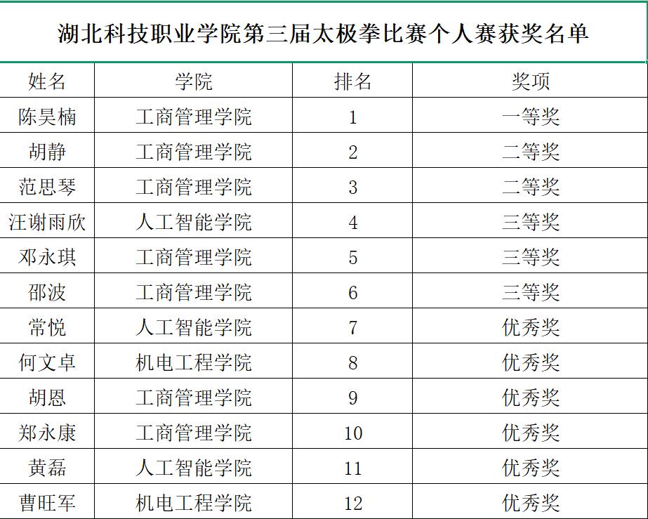 此次太极拳比赛不仅为同学们搭建了展示自我的舞台,更推动中华传统文化在校园的深度传播。工商管理学院以亮眼成绩彰显文化传承与团队协作的双重实力,让太极文化与青春活力交相辉映,激励更多学子在习武修身中感悟传统文化魅力。期待未来工管学子继续发扬拼搏精神,在校园文化建设中续写新篇。