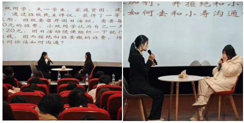 虽然平时是和蔼可亲的学长学姐,在舞台上却是“硝烟四起”。“我认为班级团建没有任何意义,为什么还要缴纳班费”、“每周的青年大学习没有任何意义,交截图也麻烦,我才不做”、“我拖凳子就要被放到表白墙上骂吗”.......助演学长学姐纷纷把自己遇到的犀利棘手问题抛给选手们。各位选手也“八仙过海,各显神通”,有的互诉衷肠感情共鸣,有的针锋相对、以理服人。充分展现了各班班委心系同学的精神风貌和帮助同学有效解决“急难愁盼”问题的工作能力。
