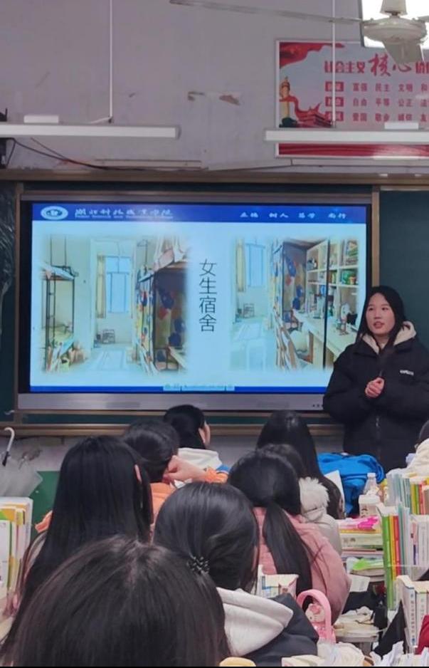 2023级旅游管理一班徐尹冉同学在放寒假后,回到了她的高中母校湖北省工业建筑学校开展“最美湖科职”带回家活动,拜访问候高中的老师,和老师分享汇报大学的专业学习、学生工作、成长经历,为即将高考的学弟学妹们加油鼓气,和学弟学妹们分享了大学里面的生活,增加高中生对我校的了解,提高我校在高中的知名度。