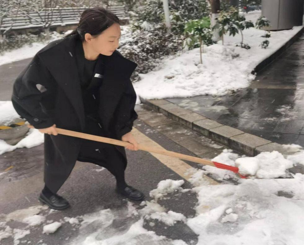 2021级酒店管理二班的唐依婷同学,寒假在武汉世贸希尔顿酒店实习。在实习期间,遇到了极端天气,冻雨和大雪的相继出现对交通造成了极大影响,她在完成自己的本职工作之后,加入了酒店的铲雪小分队,帮助清理酒店附近道路上的积雪,为酒店员工能够安全出行,出了一份力。唐依婷表示,哪里有需要就帮哪里,奉献自己的一份力量。