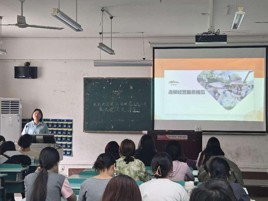 本网讯(通讯员 邓君 /图)516日下午两点,湖北科技职业学院关山校区5305教室迎来了一场别开生面的讲座。本次讲座特邀武汉欢乐谷文化旅游发展有限公司公园管理部主管王仙作为主讲嘉宾,针对2023级旅游管理专业学生进行了《连锁经营服务规范》的主题分享。