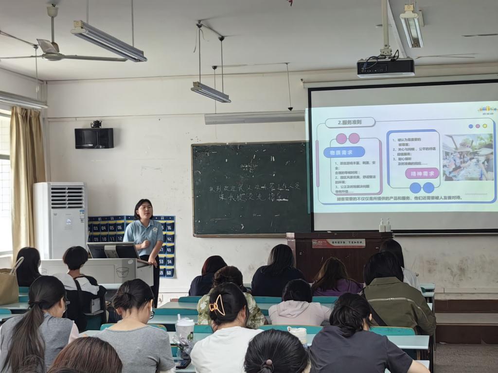 讲座伊始,王仙主管深入浅出地介绍了欢乐谷的服务理念,仔细解读了公司统一的服务准则,并结合实际案例,向学生们展示了如何在日常工作中灵活运用这些准则。