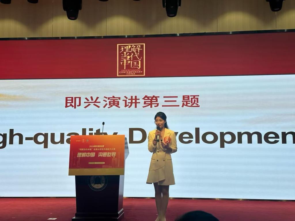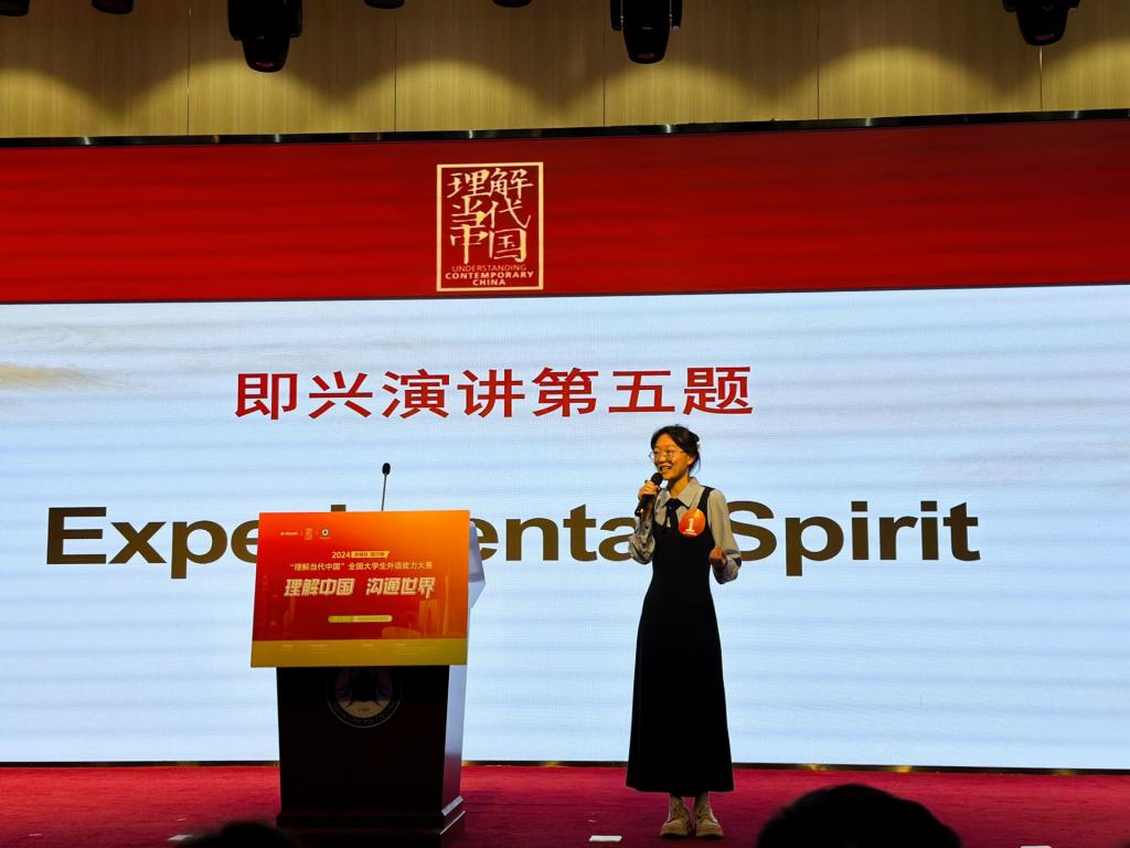 比赛环节包括定题演讲、即兴演讲和回答问题三个部分。我选手在个人演讲和面对外教的提问时从容不迫、应对自如,扎实的语言功底、流畅的口语表达、较好的思辨能力、优秀的临场发挥和自信的舞台风范令现场评委和观众印象深刻,最终以优异的成绩领先众多英语专业的参赛选手。