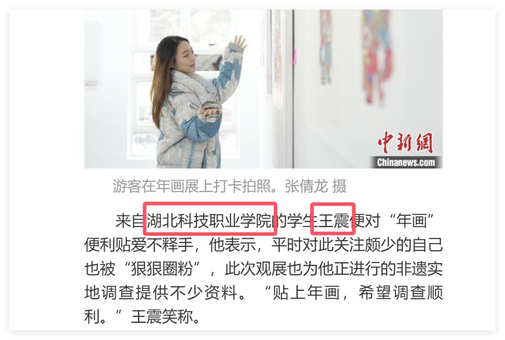由湖北科技职业学院工商管理学院 2023 级学生王震、王鹏鑫、刘容屹等组成的参赛队伍,在指导老师的精心指导下,积极参与 “2025年襄城区「年画迎新春 欢喜过大年」六〇三非遗年画嘉年华”等系列活动。活动期间,团队表现出色,受到中国新闻社、湖北日报等权威官方媒体的关注与采访报道。