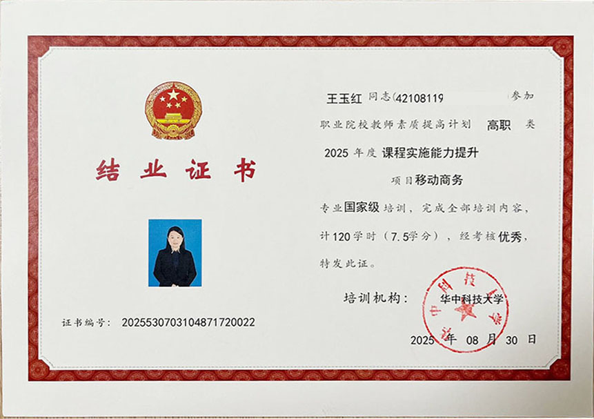2025年湖北省职业院校教师素质提高计划——“移动商务专业课程实施能力提升(高职)”国家级培训在华中科技大学圆满落幕。我校电子商务专业教师王玉红在培训中表现卓越,以优异的成绩和出色的综合表现获评“优秀学员”称号。