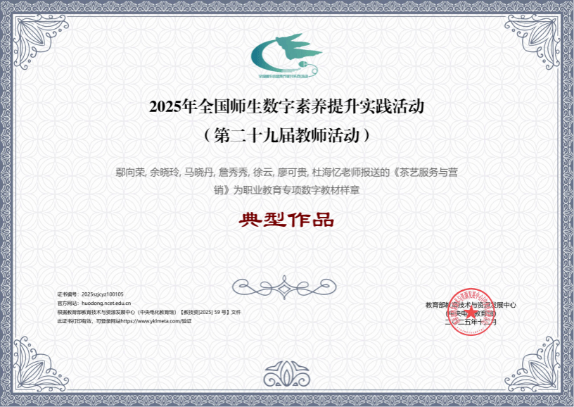 (本网讯 通讯员 刘新洁/文 鄢向荣/图)近日,教育部教育技术与资源发展中心公布了“2025年全国师生数字素养提升实践活动(第二十九届教师活动)”评选结果,由湖北科技职业学院廖可贵副教授担任副主编的《茶艺服务与营销》数字教材成功入选职业教育专项典型作品。