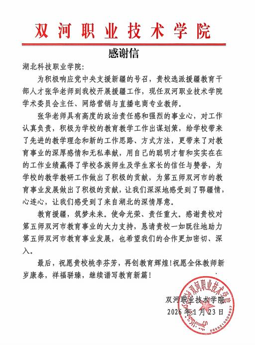 (极目新闻通讯员 富博文 刘捷)近日,湖北科技职业学院收到了来自新疆生产建设兵团第五师双河职业技术学院的感谢信。信中提到,湖北科技职业学院工商管理学院电子商务专业教师张华以其高度的政治责任感、强烈的事业心和无私的奉献精神,赢得了双河职院各族师生和学生家长的广泛信任与赞誉。“他不仅在教学教研工作中取得显著成效,也为第五师双河市的教育事业发展作出了积极贡献,生动诠释了‘鄂疆情深、心手相连’的深厚情谊。”