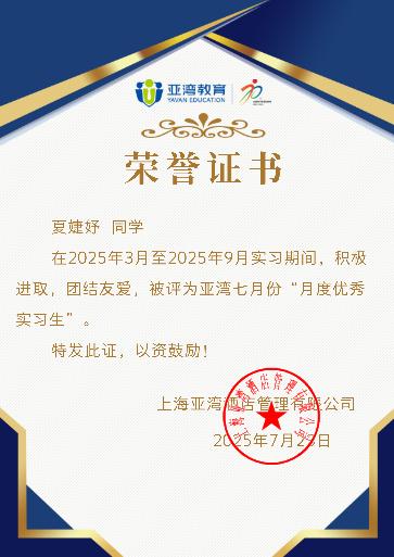 她们在自己的岗位上尽职尽责、尽善尽美,从一个初入职场的新人成长为闪闪发光的新时代职场人,在酒店实习过程中不仅获得了客人的肯定,也得到了酒店领导的高度赞扬。亚湾公司每月从来自全国30多所高校50家实习酒店共500多名实习生挑选出4位优秀实习生,颁发荣誉证书。