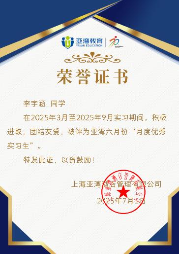 三名亚湾月度优秀实习生证书