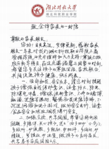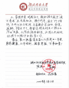 为传达学校和学院对家长的感谢与关心,学院党总支书记吕恒喜沿袭学院传统,再次亲自执笔,为学生和家长送去一封充满温情与关怀的书信。书信中对家长们长久以来的支持表示了感谢,向家长朋友们分享了学院一年来所取得的成绩,并希望家长们多陪伴、多鼓励,关心孩子的学业及身心健康发展,提醒孩子增强安全防范意识,共享春节家庭团圆之乐。手写信通过纸质和电子的方式推送给了学院每一位学生家长,一封亲笔书信,传达浓浓关怀情。